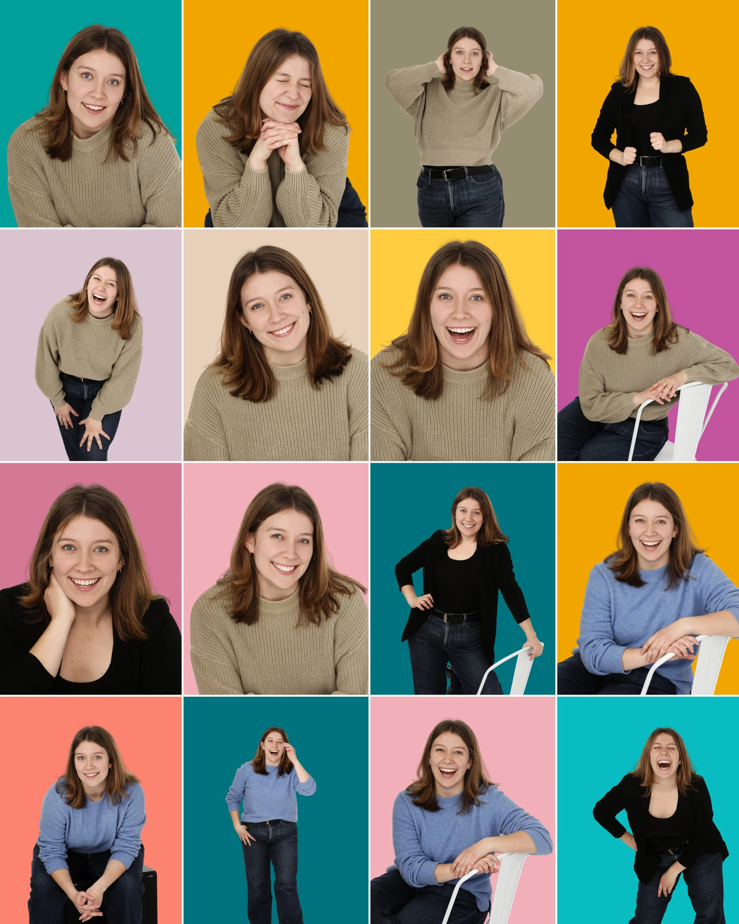 You have two choices for your session: You can choose a particular backdrop color (such as hot pink and turquoise, in the photo above). Or, you can choose the white backdrop and I can add in various backdrop colors in post (as shown below). The white backdrop is a good option if you’d like me to match the branding colors of your website, or you would like a variety of backdrop colors to choose from, with the same portraits.